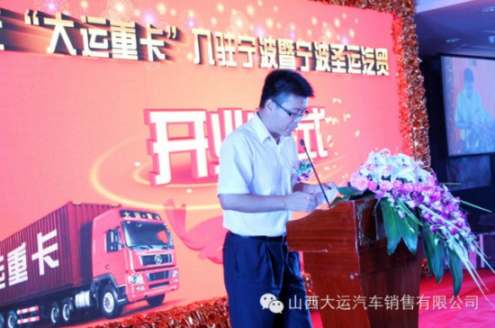 早上六點,伴隨著清晨的陣陣海潮聲,圣遠汽貿(mào)門口鞭炮齊鳴,彩帶飛舞,這是當?shù)厝颂赜辛曀,可以保佑生意興隆,財運廣進,大運相伴。雙獅舞動,共同慶祝大運重卡入駐寧波,會議正式開始后,寧波圣運汽貿(mào)焦總首先致辭,歡迎廣大客戶朋友共同來見證大運重卡入駐寧波的儀式。緊接著所有人員一起觀看圣運汽貿(mào)宣傳片“緣定大運”。宣傳片美輪美奐,體現(xiàn)了攜手大運,行大運之路的企業(yè)理念。接下來。山西大運汽車銷售有限公司市場科王文進主管代表大運工廠表示了對大運重卡入駐寧波的祝賀和對所有大運新老客戶朋友的歡迎。