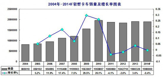 據(jù)中汽協(xié)會(huì)統(tǒng)計(jì),2004年國產(chǎn)輕型卡車(含整車、各類底盤、專用改裝車及皮卡車型等混亂統(tǒng)計(jì))銷量為80多萬輛,自2007年國產(chǎn)輕型卡車產(chǎn)銷量超過111多萬輛以來至2013年,銷量已經(jīng)達(dá)到190多萬輛(中國汽車市場研究會(huì)商用車分會(huì)統(tǒng)計(jì)銷量約為146.5萬輛,其中剔除皮卡型車輛及專用改裝車),今年也有可能達(dá)到190萬輛(中國汽車市場研究會(huì)商用車分會(huì)預(yù)計(jì)約為銷量140萬輛左右)。