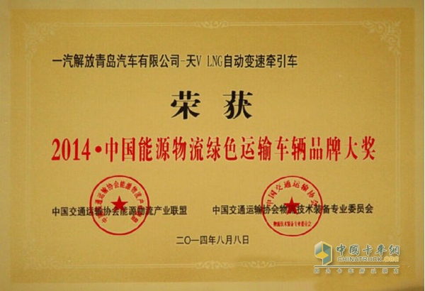 2014年8月8日,第四屆中國能源物流產(chǎn)業(yè)大會在北京隆重舉行,本次會議有中國交通運輸協(xié)會主辦、中國煤炭運銷協(xié)會等單位協(xié)辦,以“構(gòu)建大基地大通道打造中國能源物流升級版”為主題,旨在通過會議討論和交流當(dāng)前我國能源物流發(fā)展過程中所面臨的熱點難題,推動我國能源物流產(chǎn)業(yè)有序發(fā)展。會上, 一汽青島天V-LNG卡車作為會議主辦方中國道路運輸協(xié)會重點推薦的新能源車型,得到了到會嘉賓的一致好評,并被評選為“中國能源物流綠色運輸車輛品牌大獎”。
