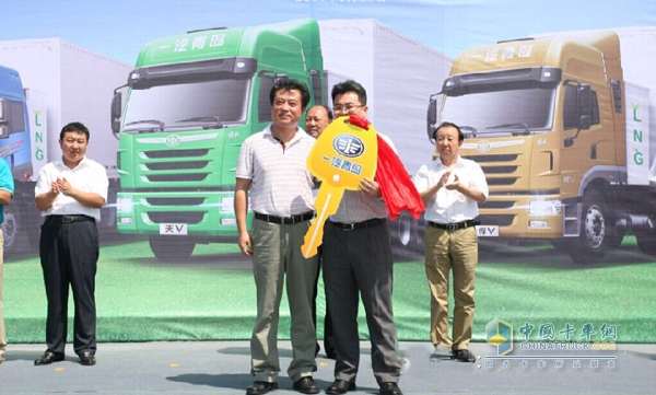 一汽青島總經(jīng)理丁大海向用戶交付了象征環(huán)保榮耀的金鑰匙