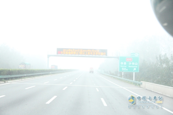 行駛到少華山附近,霧氣加重車輛開啟霧燈,駕駛變得具有難度,另外潼關(guān)段修路導(dǎo)致大貨車禁止通行,需要繞道行駛。