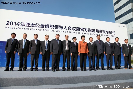 9月24日,2014年亞太經合組織(APEC)領導人會議周官方指定用車交車儀式在福田汽車總部舉行,福田汽車向APEC籌委會交付包括蒙派克S、歐輝客車等在內的約400輛汽車。該批車輛將服務于11月份召開的2014年APEC領導人會議。在整個APEC會議期間,福田汽車總計提供近450車輛,構成APEC會議最強服務車隊陣容。