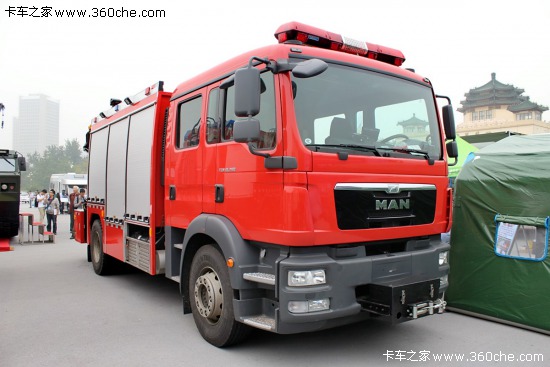 德國曼底盤的消防車躲在這兩輛車后,顯然沒有藏住這個大家伙。雙排駕駛室的外觀,讓人人感覺十分的結(jié)實。車后方搭載著升降手臂,霸氣外露,相信這輛車的動力一定很強(qiáng)勁。