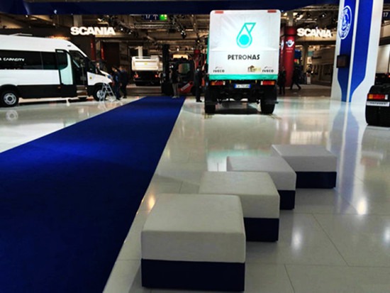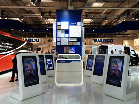 依維柯展臺(tái)以藍(lán)白色調(diào)為主,簡(jiǎn)約而不簡(jiǎn)單。
