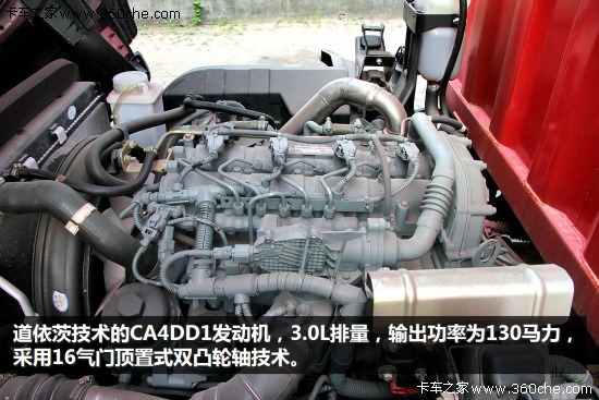 該款J6F采用的是大柴道依茨CA4DD1發(fā)動機,該發(fā)動機采用16氣門頂置雙凸輪軸,配合電裝的高壓共軌系統(tǒng),燃油經(jīng)濟性表現(xiàn)出色,結(jié)合POC+DOC的后處理技術,該車滿足國四排放標準,與之匹配的是CA5T系列的長齒五檔變速箱。