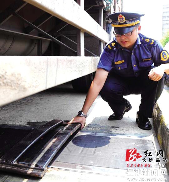 執(zhí)法人員正在演示,當(dāng)貨車將軋過(guò)地磅時(shí),犯罪嫌疑人如何利用弧形鋼板,使貨車一側(cè)輪胎未與地磅接觸,達(dá)到載重量減半的目的。