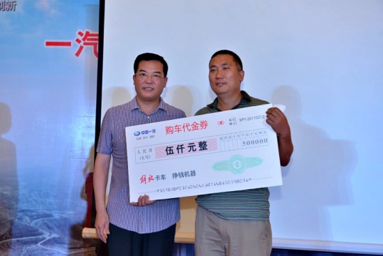 現(xiàn)場(chǎng)氣氛十分熱烈,參會(huì)用戶以他們的實(shí)際購(gòu)車行動(dòng)表達(dá)了對(duì)解放產(chǎn)品的信賴與熱愛。在現(xiàn)場(chǎng)購(gòu)車環(huán)節(jié),在短短的1小時(shí)之內(nèi),自卸車用戶以極大的熱情把銷售數(shù)量定格在了146臺(tái),甚至有幾位用戶一次性訂購(gòu)了10臺(tái)解放J6自卸車。為了答謝用戶的厚愛,解放公司通過(guò)訂車抽獎(jiǎng)最高獎(jiǎng)項(xiàng)8000元的形式回報(bào)了用戶的熱情。